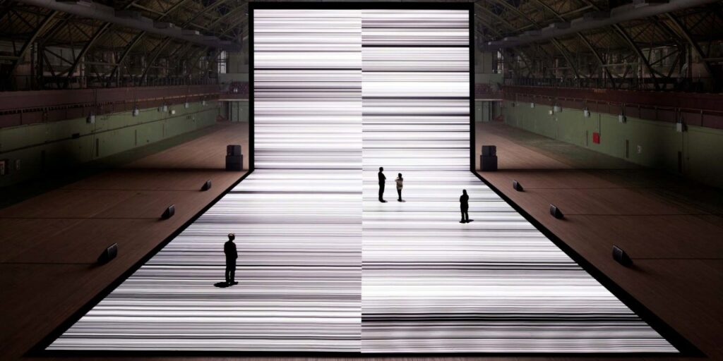 Ryoji IKEDA, The transfinite, 2011, mixed media, dimensions variables, Park Avenue Armory, New York → Transformation : données traduites en lumière et son. Expérience immersive où le spectateur est physiquement affecté. Le numérique modifie la perception sensorielle de l’espace.