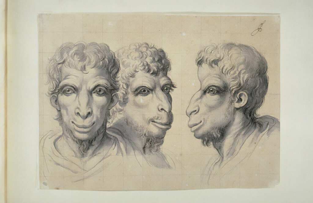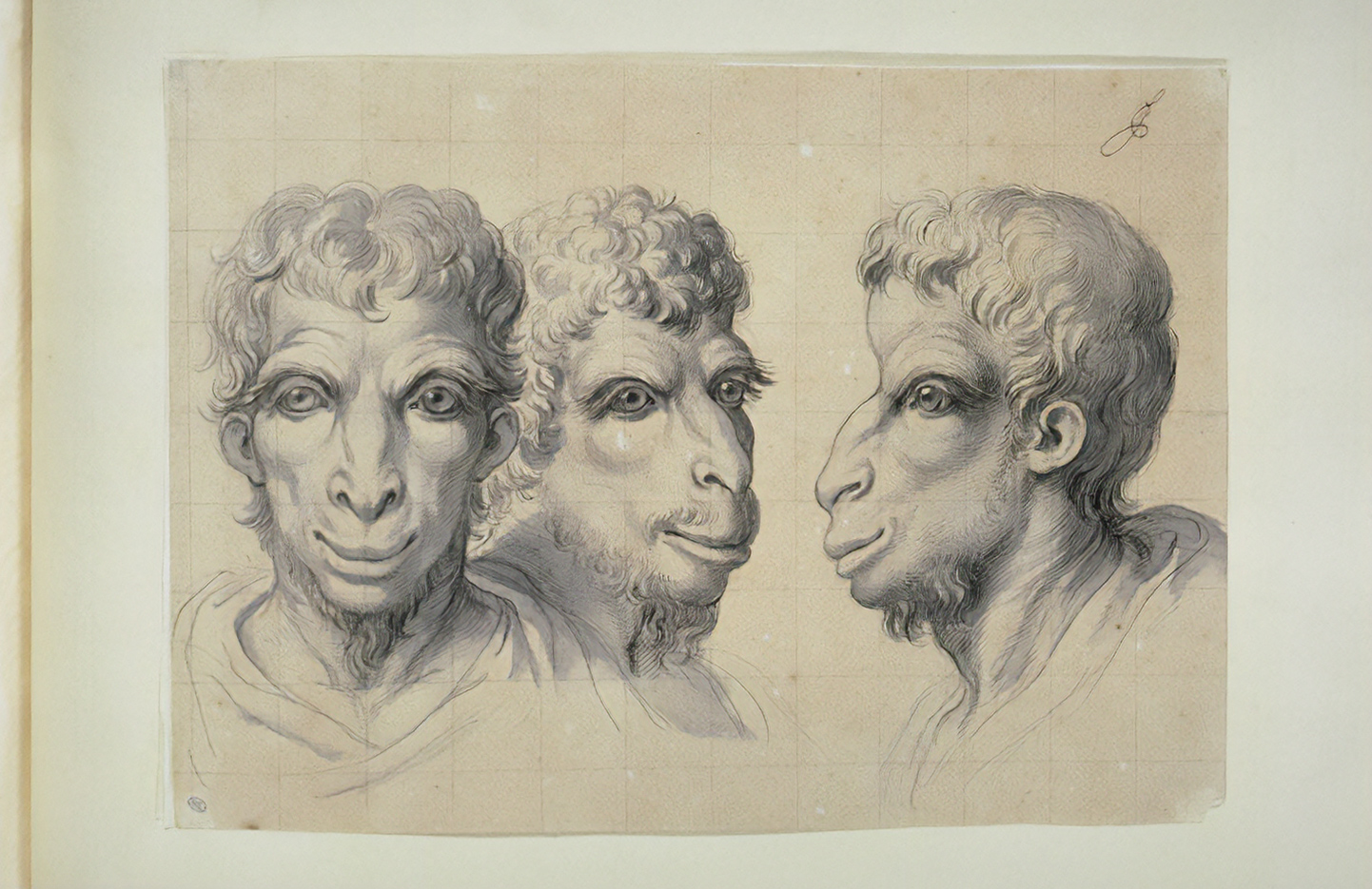 - Charles LE BRUN (1619-1690), Trois têtes physiognomoniques inspirées par le chameau, date indéterminée (17e), plume, encre noire, pinceau, lavis gris et gouache blanche, sur papier, 22,7 × 32,8 cm, Département des Arts graphiques du Louvre