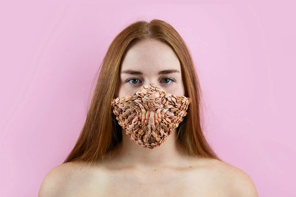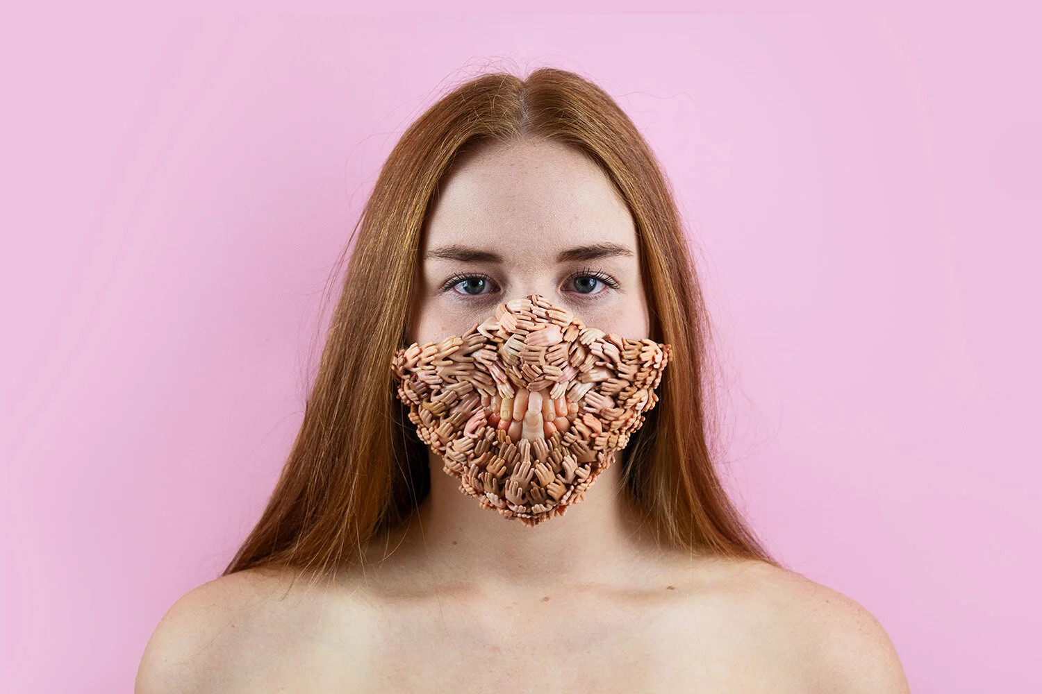 - Freya JOBBINS, Mask #1 Firewall, 2020, assemblage de fragments de poupées en matière plastique formant un masque