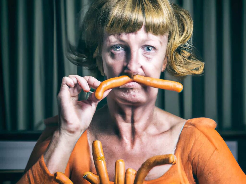 - Albertine MEUNIER (1964), HyperChips #190, 2023, image créée avec Dall-E. Artiste numérique depuis plus de vingt-cinq ans, Albertine Meunier s’empare de l’IA générative en 2023 pour créer cette série de 303 autoportraits réalisés à partir du prompt « Albertine Meunier mange des saucisses et des frites ». Le résultat, troublant, oscille entre humour et répulsion.