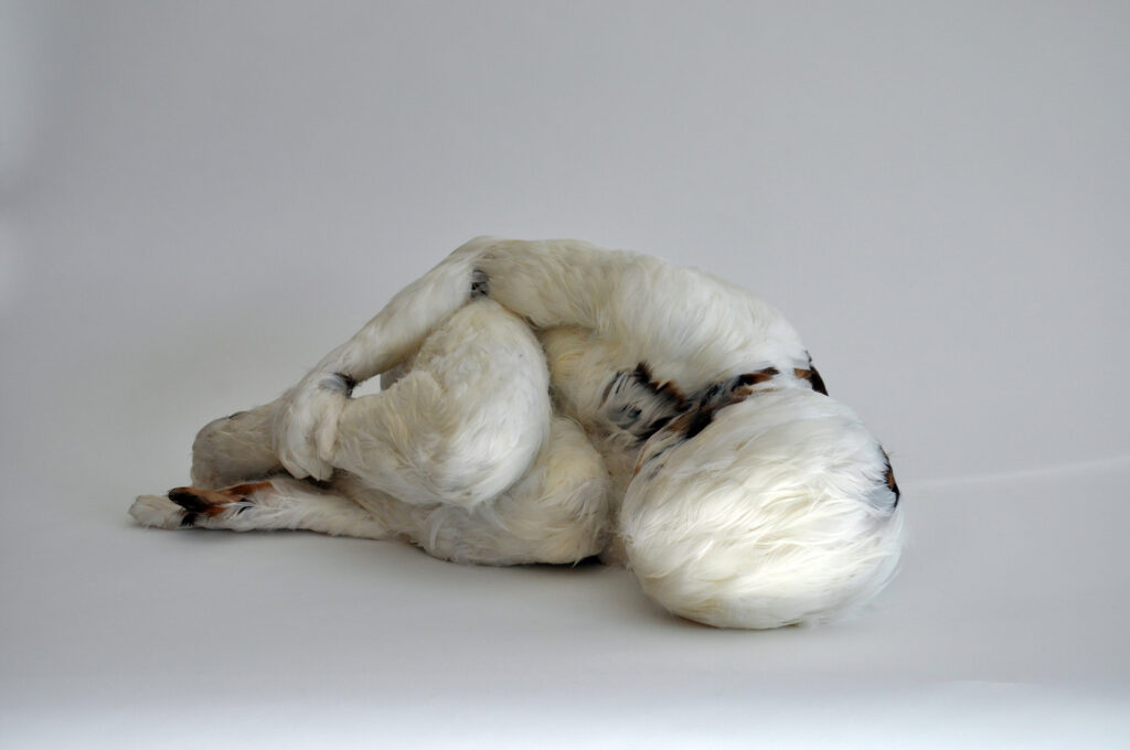 - Lucy GLENDINNING, Feather Child 1, 2011, cire, résine acrylique, bois, plumes de canard et de faisan, 78 × 61 × 28 cm, Collection de l’artiste