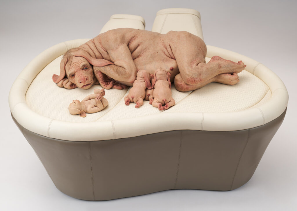 - Patricia PICCININI (1965), The Young Family, 2002-2003, sculpture hyperréaliste d’êtres hybrides entre humains, animaux, silicone, fibre de verre, cuir, cheveux, contreplaqué, 85 × 150 × 120 cm, Coll. part.