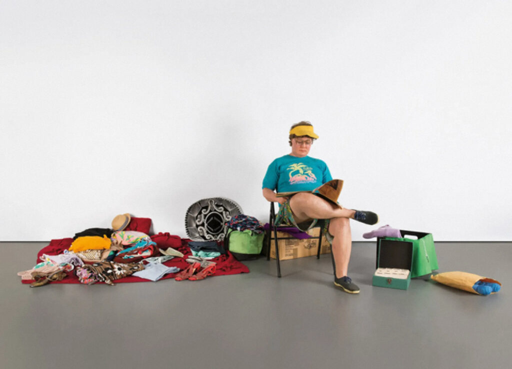 Duane HANSON, Flea Market Lady, 1990, installation, bronze polychrome, textile, journal, objets trouvés et chaise pliante en métal, dimensions variables, Coll. particulière.
