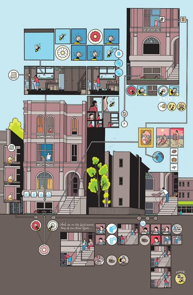 Chris WARE, Building Stories – Spring, 2012, comic → séquentialité non linéaire, fragmentation spatiale de la page.