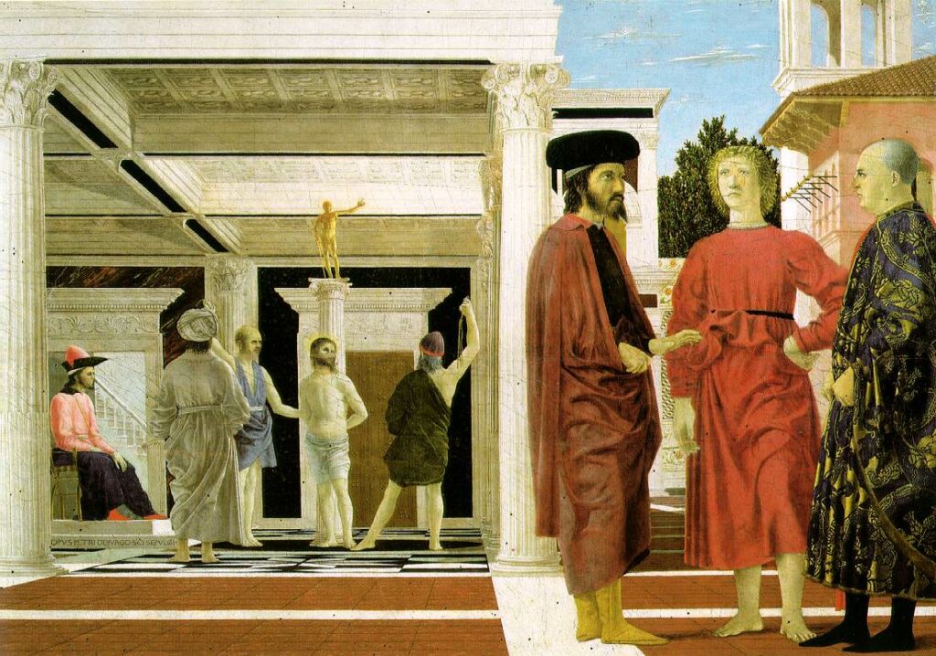 Piero della FRANCESCA, La Flagellation du Christ, 1459, tempera sur bois, 58,4 x 81,5 cm, Galleria Nazionale delle Marche, Urbino (Italie). La composition est rigoureusement organisée. Le tableau est séparé en deux scènes par une colonne qui soutient l’espace où a lieu la flagellation : à gauche, au fond d’une loggia, une scène représentant la flagellation et à droite, au premier plan, un groupe de trois personnages. Les deux scènes sont éclairées chacune depuis une direction différente : depuis la gauche pour le groupe de droite, et depuis la droite pour le groupe du fond situé à gauche. Les ombres sont discrètes. Daniel Arasse (historien) définit l’espace [irréel] de ces représentations comme « la somme des lieux [des scènes anachroniques] → L’espace architectural représenté comme page.