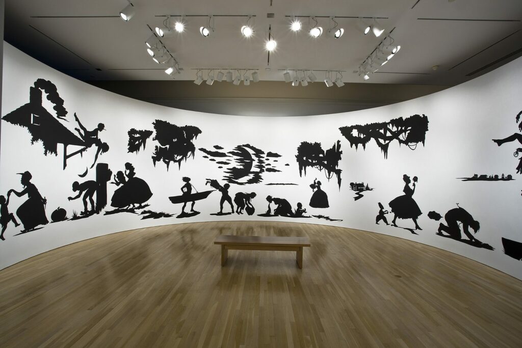 Kara WALKER, Gone, An Historical Romance of a Civil War as it Occurred between the Dusky Thighs of One Young Negress and Her Heart, 1994, papier découpé sur mur, installation à dimensions variables, env. 396,2 × 1 524 cm, vue de l’installation : Selections 1994, The Drawing Center, New York, 1994 → narration en silhouettes monumentales, frise panoramique pour une lecture en mouvement.