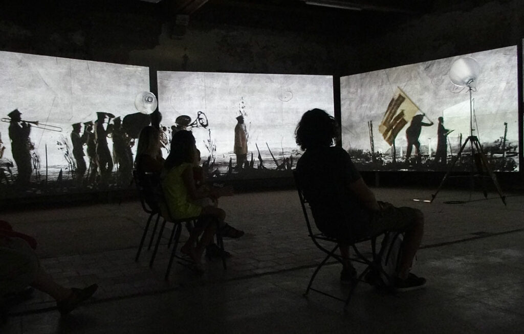 William KENTRIDGE, More Sweetly Play the Dance, 2015, installation, vidéo 8 canaux haute définition, 15 min, avec 4 porte-voix, chaises et tabourets, dimensions variables → le récit entre les images, la