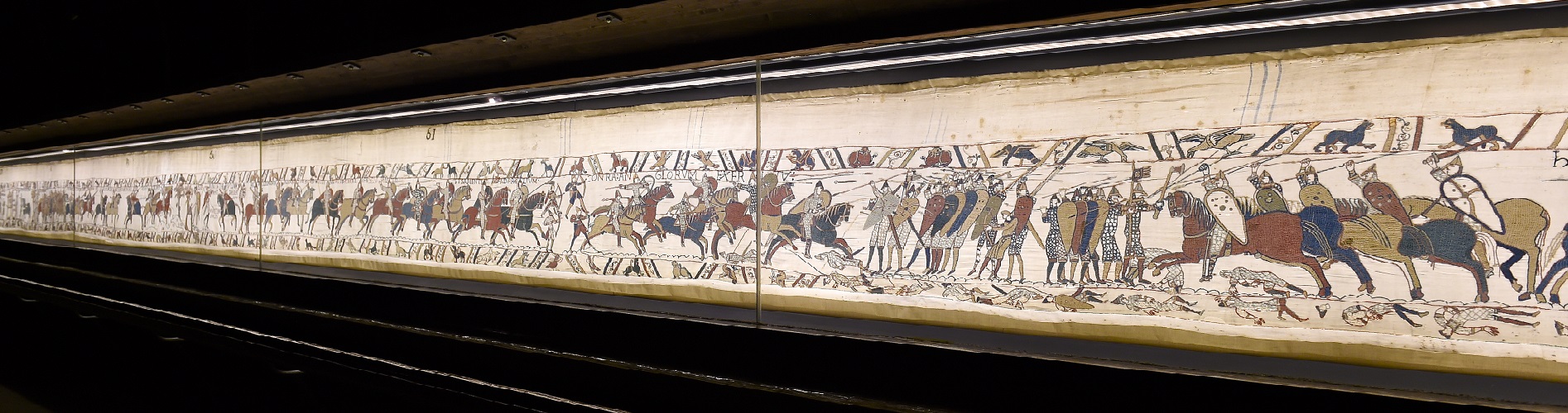 Tapisserie de Bayeux, 1066-1083, broderie (anciennement « tapisserie aux –points d’aiguille ») longue de 68,30 m et haute de 50 cm, toile en lin, broderie Crewel en laine. Les péripéties de la bataille — dans un récit continu sans séparation stricte de cases — dont l’issue détermina la conquête normande de l’Angleterre, y sont détaillées. Sa lecture nécessite le déplacement du spectateur.