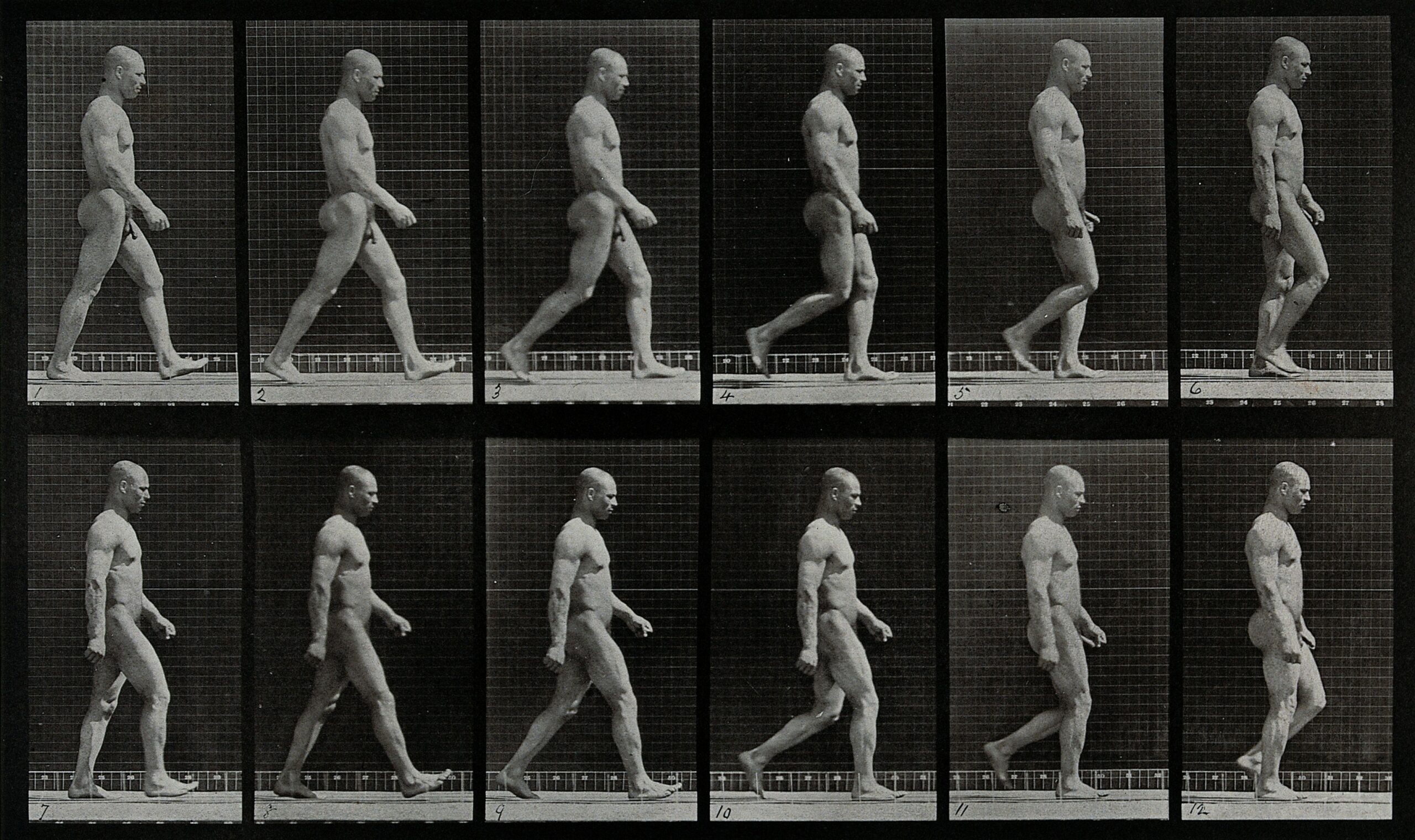 Eadweard MUYBRIDGE, A man walking, 1887, chronophotographie → décomposition du mouvement.