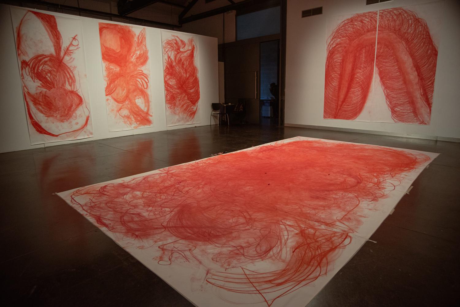 Montserrat ARÁNEGA SEGÚ, Som el foc que abrasa (series), 2024, dessin au pastel sur papier, 150 x 300 cm, L’Estruch, Fàbrica de creació de les arts en viu, Barcelone, Espagne