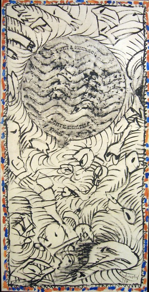 Pierre ALECHINSKY (1927), Vanité Citadine, 1987, huile sur toile (empreinte plaque d’égout), 95 x 190 cm, Coll. privée