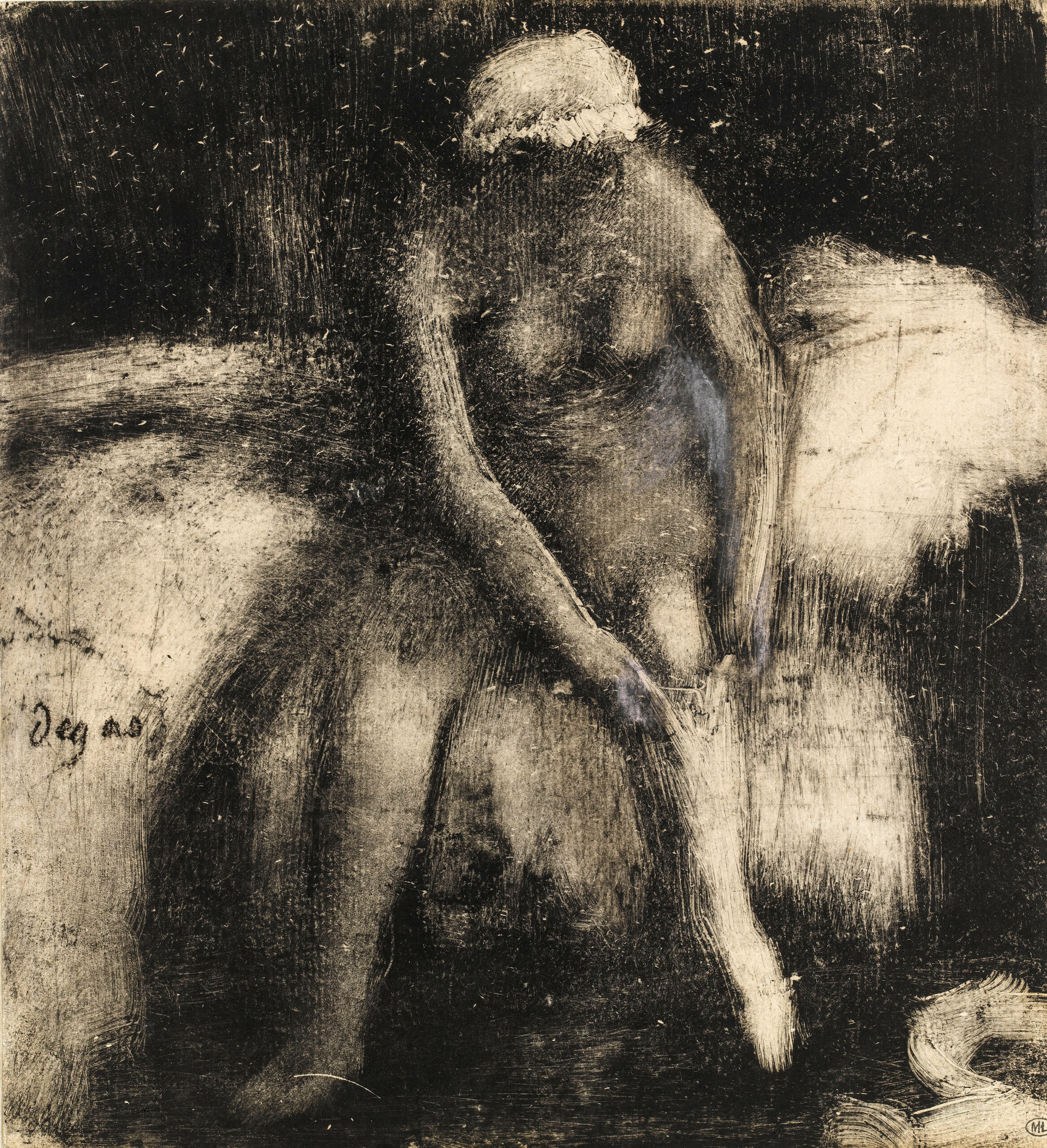 Edgar DEGAS (1834-1917), Femme mettant ses bas, 1879, monotype à l’encre noire, 15,9 × 11,8 cm, collection Mary Cassatt, conservé au musée du Louvre. Figure majeure du monotype, Edgar Degas explore la transparence, l’obscurité, la suggestion du mouvement, souvent complétée au pastel.