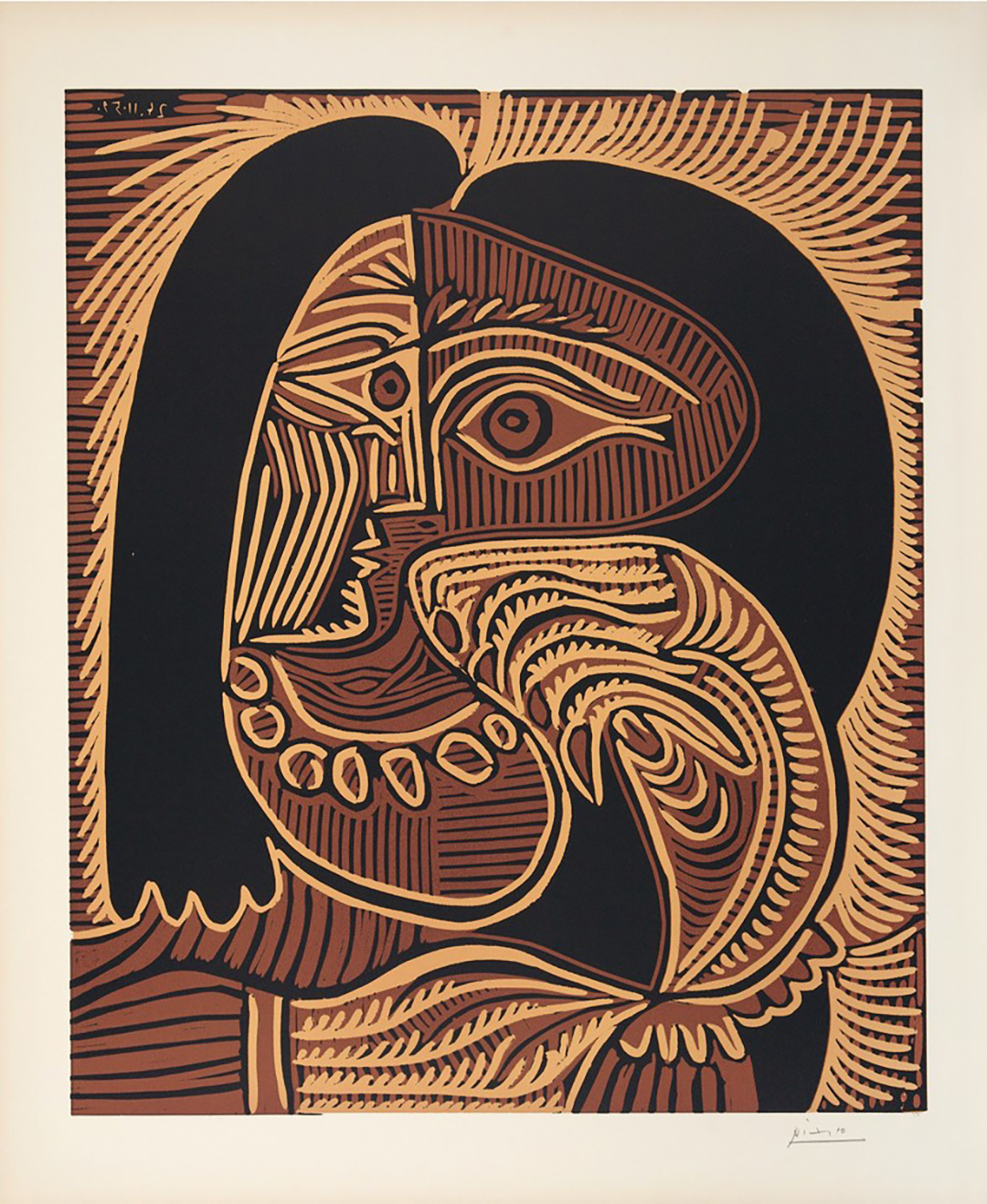 Pablo PICASSO (1881-1973), Femme au collier, 1958, linogravure originale en trois couleurs sur papier Arches, 64 x 53 cm, Succession Picasso. La linogravure en réduction (linogravure perdue) est une technique permettant d’obtenir plusieurs couleurs sur une seule estampe à partir d’une seule plaque. Picasso grave une première couche, et l’imprime sur l’ensemble du tirage, puis grave une autre couche, et l’imprime à nouveau sur le même support, et l’artiste répète l’opération autant de fois que nécessaire.