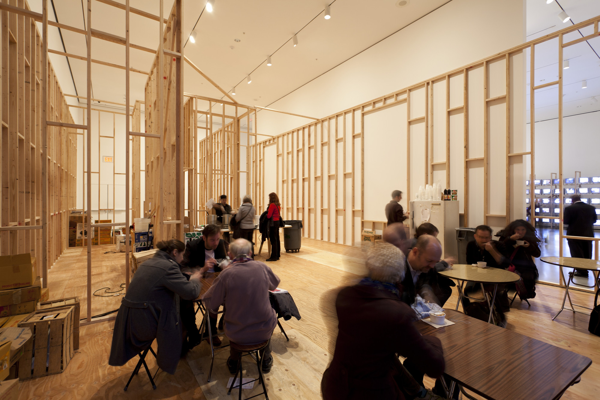 - Rirkrit TIRAVANIJA — Untitled (free) (1992) et Untitled (free/still) : Tiravanija installe, cuisine et offre le repas dans la galerie à la galerie 303 dans le quartier SoHo de Manhattan ; la convivialité et l’usage de l’espace comme lieu social transforment l’exposition en lieu d’échange. Ici, le dispositif muséal (tables, réfrigérateur, chaises) est conçu pour provoquer rencontres et conversations — la réalisation de l’œuvre dépend de la présence et des gestes du public. L’œuvre a connu plusieurs itérations depuis lors.