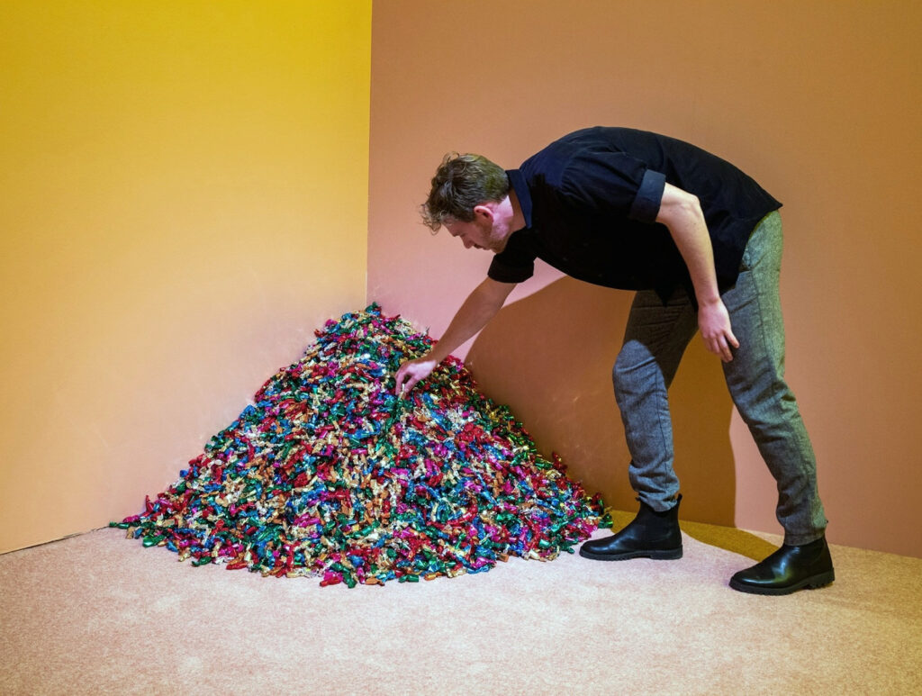- Félix GONZÁLEZ-TORRES — Untitled (Portrait of Ross in L.A.) (1991) : pile de bonbons que le public peut prendre ; le geste de prendre (toucher, consommer) est central : l’œuvre fait du toucher, de l’action du visiteur un élément constitutif du sens (: perte, mémoire, absence).