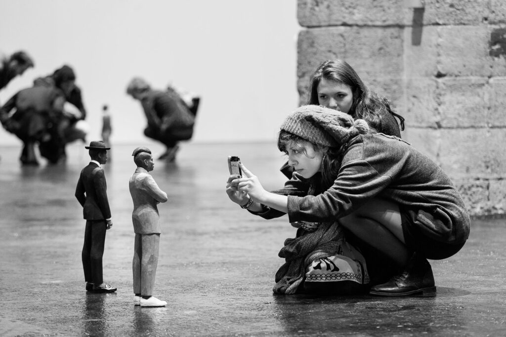 - Erwin WURM (1954), Der Idiot, 2010. La série des One Minute Sculptures sont des sculptures éphémères créées par des visiteurs volontaires qui acceptent de suivre les instructions de l’artiste. Dans ce cas, il s’agit de monter sur une estrade, et de se mettre une chaise sur la tête en passant les bras sous les accoudoirs.