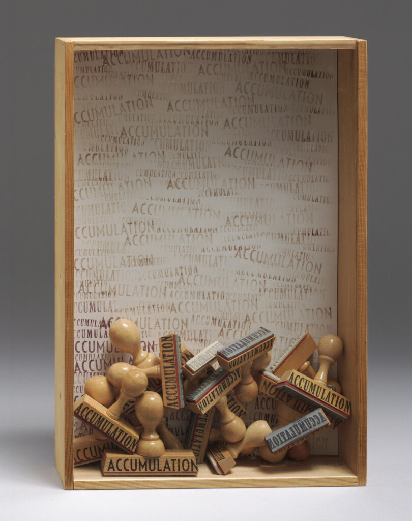 • ARMAN (1928-2005), Accumulation, 1973, multiples tampons en caoutchouc et de papier dans une boîte en bois avec couvercle en plexiglas, 47 x 32 x 8,4 cm, MoMA, New York, États-Unis