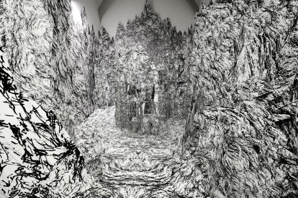 • Sui PARK (1977), Flow, 2015, installation, colliers de serrage rapide noirs, 213,4 × 121,9 × 213,4 cm, Coll. de l’artiste, https://www.suipark.com/FLOW