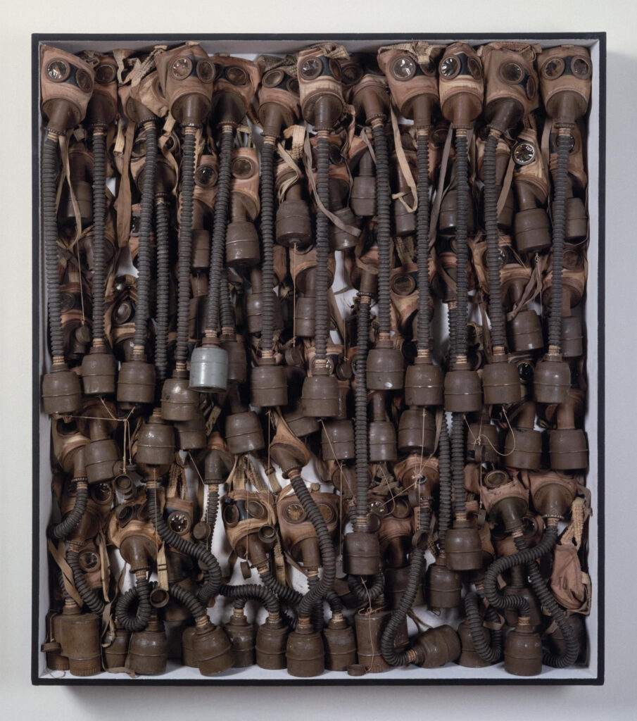 • ARMAN (1928-2005), Home, Sweet Home, 1960, accumulation, masques à gaz, boîte en bois et plexigas, 160 x 140,5 x 20,3 cm, Centre Pompidou, Paris
