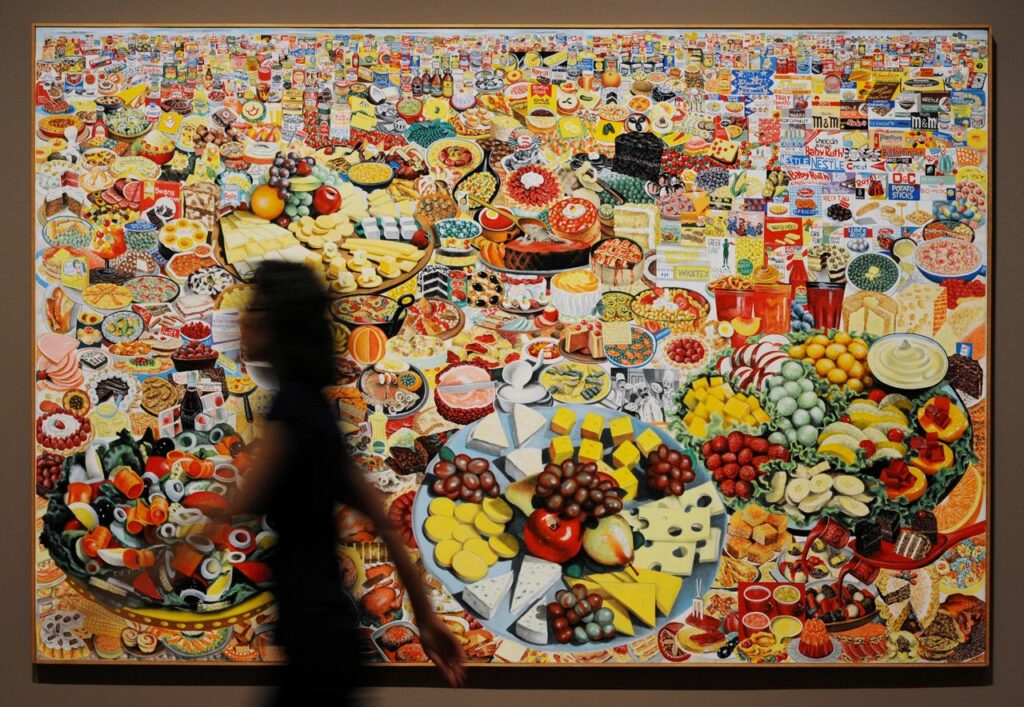 • ERRÓ (1932), Foodscape, 1964, collage monté sur toile, 200 × 300 cm, Coll. Pinault, Paris. Foodscape fait partie du « discours visuel » de l’artiste islandais sur la figuration narrative. Rempli d’images culinaires, ce collage reflète la croissance effrénée de la consommation dans les sociétés occidentales. Le travail humoristique et irrévérencieux d’Erró souligne l’absurdité d’une telle abondance.