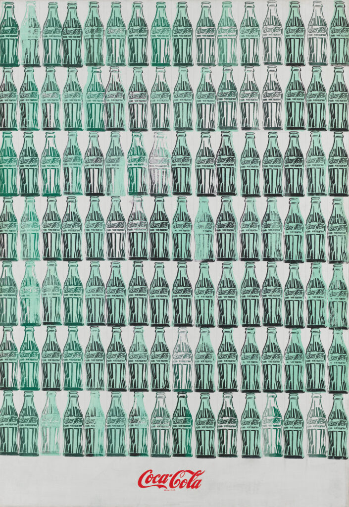 • Andy WARHOL (1928-1987), 210 Coca-Cola Bottles (210 bouteilles de Coca-Cola), 1962, sérigraphies et acrylique sur toile, 209,6 x 266,7 cm, Coll. particulière. Il s’agit de la plus grande et la plus complexe de la série de peintures de bouteilles de Coca-Cola de Warhol. Une version verticale plus petite (210,2 × 120,53 cm), Green Coca-Cola Bottles (1962), fait partie de la collection du Whitney Museum of American Art à New York.