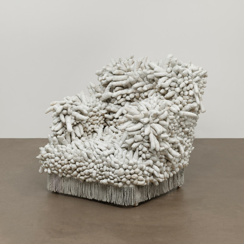 • Yayoi KUSAMA (1929), Accumulation no1 (Compulsion Furniture), 1962, fauteuil, tissu rembourré cousu, peinture à l’émail et frange de chaise, 94 x 99,1 x 109,2 cm, MoMA, New York. Au cœur de cette sculpture se trouve un fauteuil ordinaire. Mais il est couvert de centaines de saillies de tissu cousues à la main et farcies qui semblent pousser sur la chaise.