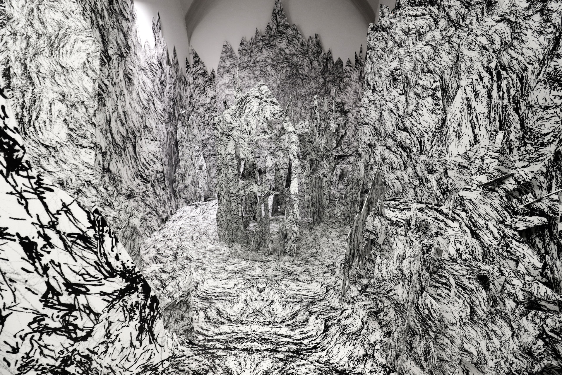 • Anaïs LELIÈVRE (1982), Stratum (9), 2021, installation, modules en PVC forex imprimé du dessin Schiste argileux (Sion) / Rassemblement de toute la série d’installation modulaires Stratum 3, 4, 5, 6, 7, 8, avec l’ajout d’une nouvelle partie, Stratum 9 / Exposition Anaïs Lelièvre, expérience d’espaces, Chapelle de la Visitation – espace d’art contemporain, Thonon-les-Bains. La Chapelle de la Visitation réunit pour la première fois toutes les installations modulaires Stratum. Cette série dérive d’une pierre de schiste, trouvée de l’autre côté du Lac Léman lors de marches dans le Valais en 2018.